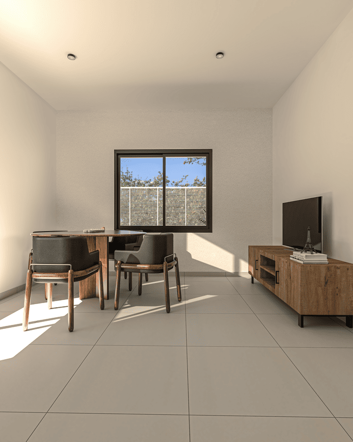Construida con paredes de hormigón celular con doble malla de hierro, garantiza aislación térmica y acústica, además de una gran resistencia. Sus amplias aberturas incluyen un ventanal doble hoja de 2,05 x 1,50 m, dos ventanas de 1,50 x 1,50 m y una ventana de 50 x 40 cm, aportando excelente iluminación y ventilación.